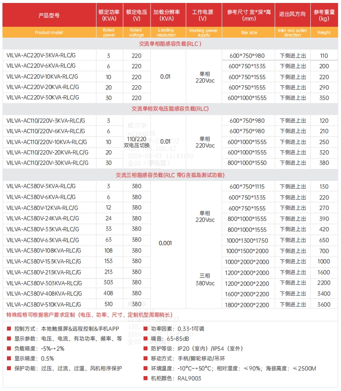 產(chǎn)品規(guī)格:VILVA-RLC交流單/三相阻感容負載箱